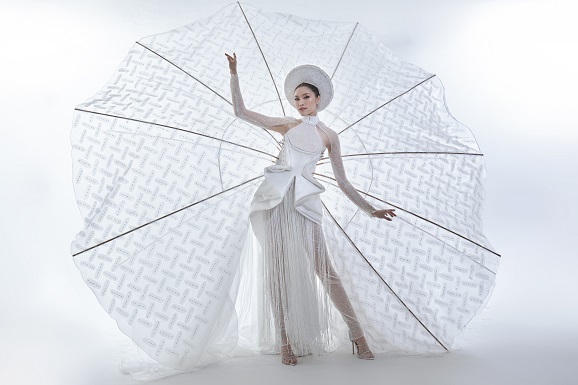 Bộ jumpsuit được thực hiện kỳ công và tỉ mỉ bằng kĩ thuật đính kết khéo léo, sử dụng hạt cườm, kim sa giúp trang phục trở nên lung linh và ấn tượng hơn. Phần tua rua của chân váy là điểm nhấn độc đáo, tạo độ mềm mại, thướt tha. Phần mấn đội đầu được làm thủ công, truyền tải vẻ đẹp truyền thống của người Việt Nam.