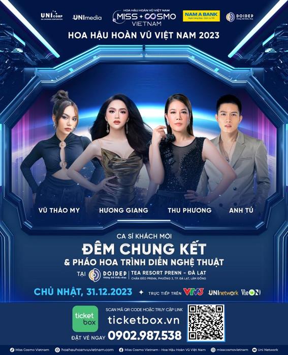 Tintuc - Diễn ra vào ngày 31/12/2023 tại Tea Resort Prenn (Chân đèo Prenn, Phường 3, TP. Đà Lạt, Lâm Đồng), đêm Chung kết của Hoa hậu Hoàn vũ Việt Nam – Miss Cosmo Vietnam 2023 hứa hẹn sẽ mang đến một bữa tiệc nhan sắc và âm nhạc mãn nhãn với sự xuất hiện của dàn khách mời là các ca, nghệ sĩ đình đám: ca sĩ Thu Phương, ca sĩ Hương Giang, ca sĩ Anh Tú và ca sĩ Vũ Thảo My.