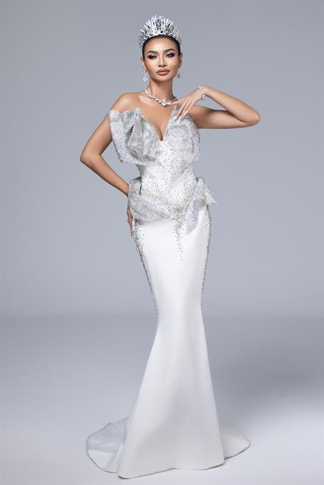 Ở layout đầu tiên, Top 2 Miss Cosmo 2024 gây ấn tượng mạnh khi tự tin khoe dáng trong hai thiết kế dạ hội ôm sát lấp lánh, tôn đường cong quyến rũ “đốt mắt” người nhìn. Hoa hậu Ketut Permata Juliastrid diện chiếc váy được lấy cảm hứng từ sự tan chảy của băng, mang vẻ đẹp tinh tế của sự chuyển hóa, kết hợp hài hoà giữa vẻ đẹp lạnh lùng và sự mềm mại tự nhiên. Các đường nét uyển chuyển với sắc thái mờ ảo cùng chất liệu trong suốt tạo nên cảm giác huyền bí và lãng mạn. Trong thiết kế này, Đương kim Miss Cosmo đẹp mong manh nhưng đầy mê hoặc. Á hậu Karnruethai Tassabut diện chiếc đầm đuôi cá màu trắng với chi tiết đính bạc lấp lánh, thể hiện vẻ đẹp sự sang trọng và tinh tế. Những ánh bạc phản chiếu dưới ánh đèn tạo nên vẻ đẹp lung linh, tôn lên đường cong mềm mại và thần thái hút hồn của nàng Á hậu. Điểm nhấn trong layout này chính là chiếc vương miện danh giá IMPACTFUL CROWN và IMPACTFUL TIARA được chế tác tinh xảo, góp phần tôn lên khí chất của Top 2 Miss Cosmo 2024. Đây cũng chính là hình ảnh được lựa chọn xuất hiện trên trang bìa Harper’s Bazaar số tháng 02/2025.
