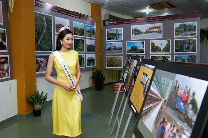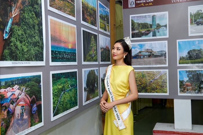 Trong triển lãm ảnh, Hoa khôi Diễm Trinh có dịp nhìn ngắm lại những cảnh đẹp của mảnh đất Long An. Cô chăm chú quan sát, ghi nhớ lại từng khoảnh khắc giá trị và ấn tượng. Hai nàng Á khôi Sông Vàm cùng chung cảm xúc tự hào và hạnh phúc khi hình ảnh con người và phong cảnh Long An, miền Tây Nam Bộ hiện lên vô cùng sống động trong những bức ảnh. “Sinh ra và lớn lên ở Trà Vinh, Thanh Thanh vô cùng trân quý và tự hào khi bản thân là người con của vùng đất Tây Nam Bộ. Nơi mà con người thật thà, chất phác và nghĩa tình” – Á khôi 1 Hoa khôi Sông Vàm 2022 hạnh phúc chia sẻ.
