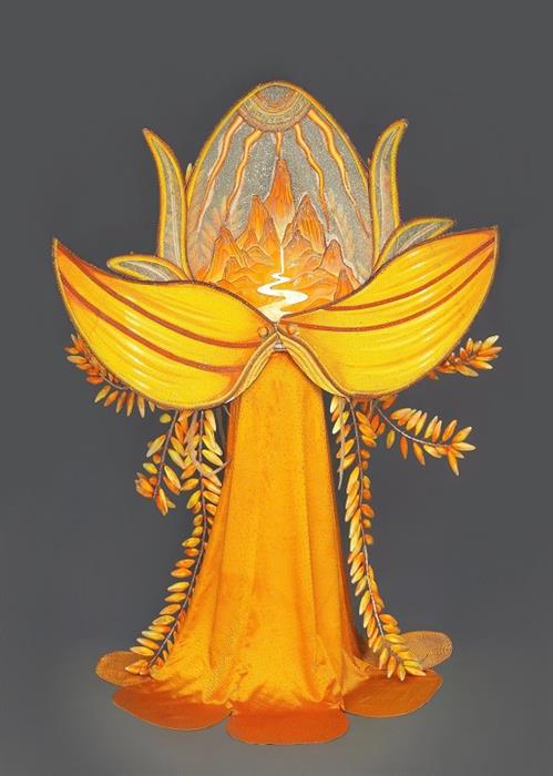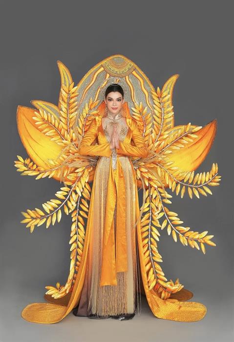 Tintuc - “Kim Thực” là bộ trang phục dân tộc được lấy ý tưởng từ cây lúa, con cò, chim hạc và mặt trời. Bộ trang phục tái hiện lại cánh đồng lúa Ninh Bình và non sông Việt Nam, tất cả đều được nằm gọn trong một tép lúa vàng. Ninh Bình là một trong những nơi có cánh đồng lúa đẹp nhất nhì Việt Nam.