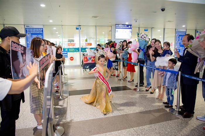 Đạt được thành tích cao đáng nể, trong niềm vui hân hoan khi về nước, Tân Hoa hậu Hoàn vũ nhí thế giới 2019 Nguyễn Ngọc Bảo Anh được chào đón vô cùng nồng nhiệt. Giây phút người đẹp nhí bước ra từ khu vực check-out đã khiến không khí nơi đây thực sự vỡ òa.