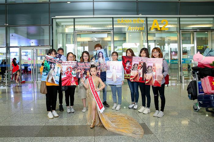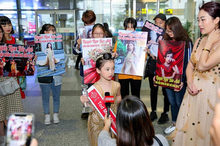 Ra đón Nguyễn Ngọc Bảo Anh ở sân bay là đông đảo người hâm mộ. Không chỉ mang theo hoa, quà để tặng cho Nữ hoàng sắc đẹp nhí mới của thế giới, rất nhiều fan còn mang theo băng rôn, hình ảnh của Nguyễn Ngọc Bảo Anh trong cuộc thi và không ngừng gọi tên Bảo Anh để thể hiện sự yêu mến.