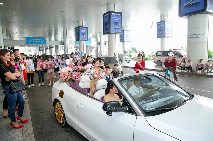 Chính tình cảm và sự quan tâm yêu thương của mọi người đã khiến Hoa hậu nhí Bảo Anh không còn mệt mỏi sau chuyến bay dài, Hoa hậu Hoàn vũ nhí thế giới 2019 cười tươi và xúc động. Hoa hậu nhí Bảo Anh liên tục nở nụ cười, vẫ tay chào khán giả. Hoa hậu Hoàn vũ nhí thế giới 2019 Nhuyễn Ngọc Bảo Anh đã được đón bằng chiếc Audi RS5 mui trần với nội ngoại thất được dát ‘vàng’ độc nhất tại Việt Nam. Tân Hoa hậu Hoàn vũ nhí thế giới 2019 cũng rất xúc động khi được chị gái – Hoa hậu nhí Châu Á Thái Bình Dương 2018 Nguyễn Ngọc Trang Anh từ xa chạy đến, ôm vào lòng.