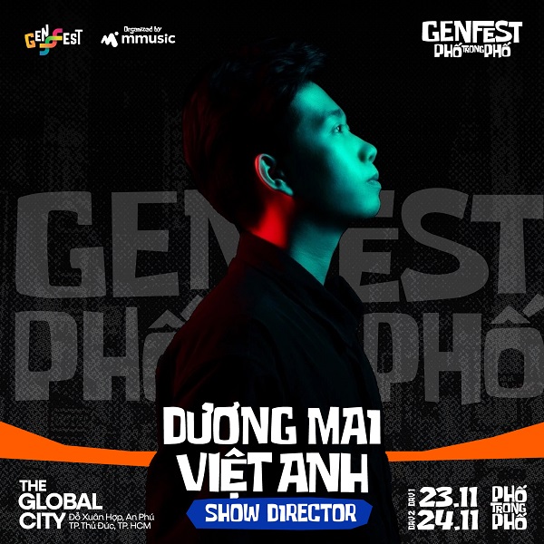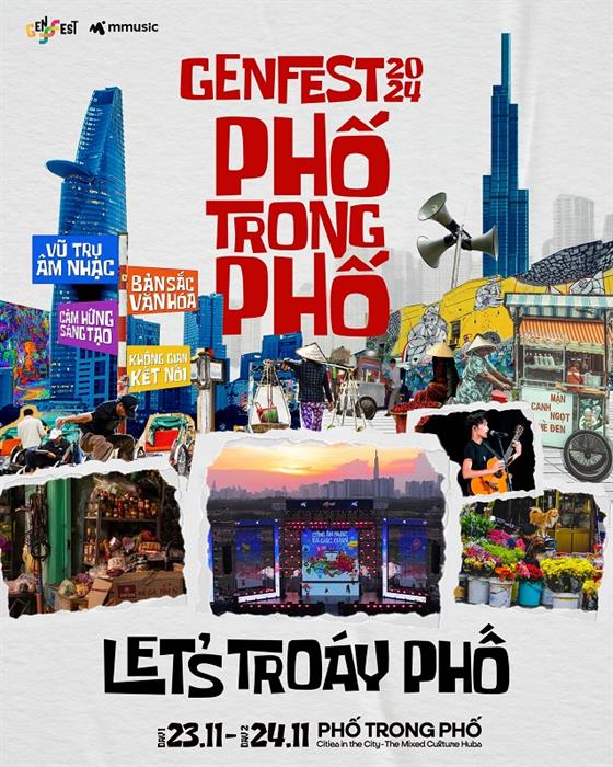 Trở lại sau thành công rực rỡ của GENfest 2023 với chủ đề “Cổng Âm Nhạc Đa Giác Quan”, GENfest 2024 được tổ chức bởi MMUSIC với chủ đề Phố Trong Phố sẽ diễn ra trong 2 ngày 23/11 và 24/11 tại Trung tâm mới The Global City (TP. HCM).