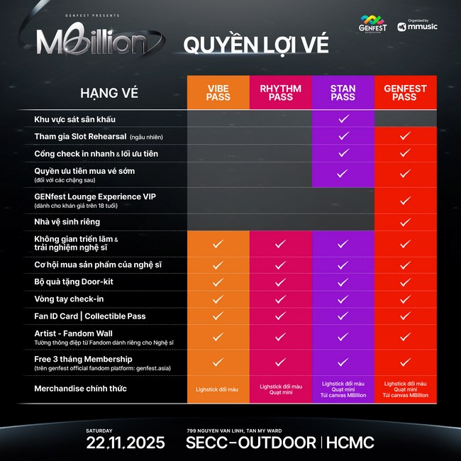 GENfest Presents MBILLION bắt đầu mở bán vé từ ngày 13/10/2025. Các hạng vé VIBE PASS, RHYTHM PASS và GENFEST PASS trên flip.vn. Hạng vé STAN PASS đặc biệt dành cho cộng đồng fan của nghệ sĩ và GENfest sẽ được bán độc quyền trên genfest.asia – nền tảng fandom chính thức của GENfest: WELOVECULTURE.
