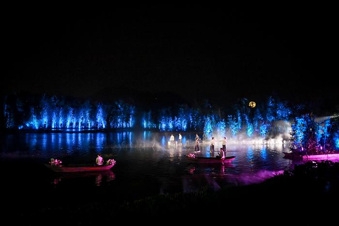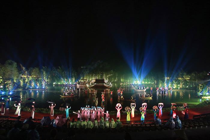 Tintuc - Hài hòa non nước, sân khấu vở diễn thực cảnh Tinh hoa Bắc bộ nằm ngay dưới chân núi Thầy (xã Sài Sơn, Quốc Oai, Hà Nội), trên mặt hồ nước rộng 4300m2.