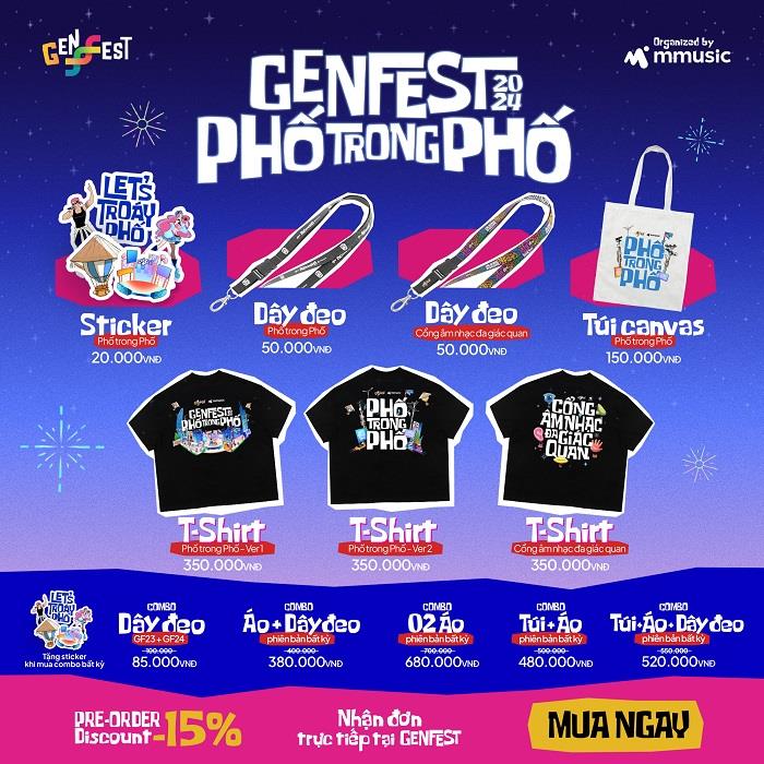 Ngày 11/11, GENfest 2024 cũng chính thức công bố mở bán merchandise gồm áo phông, túi canvas, dây đeo thẻ, bộ sticker. Tất cả đều được thiết kế với chủ đề “Phố Trong Phố” và “Cổng Âm Nhạc Đa Giác Quan”, mang màu sắc nổi bật và tinh thần trẻ trung, hiện đại. Đây chắc chắn là những phụ kiện không thể thiếu cho các bạn trẻ tham dự GENfest 2024 năm nay.
