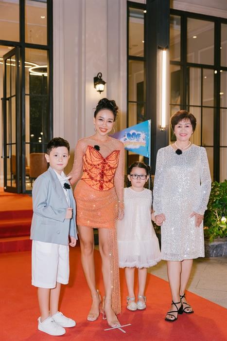 Thảo Trang không chỉ xuất hiện cùng con trai Alex mà còn có sự đồng hành của mẹ nữ ca sĩ. Cả gia đình gây bất ngờ với trang phục lấp lánh khi đến dự tiệc với mong muốn mang đến không khí nhiều màu sắc, tươi vui cho mọi người. Riêng con trai Alex lại chọn trang phục thanh lịch hơn. Tại thảm đỏ, cậu bé còn hài hước thừa nhận mình khác biệt với mẹ khiến Thảo Trang chỉ biết bật cười.