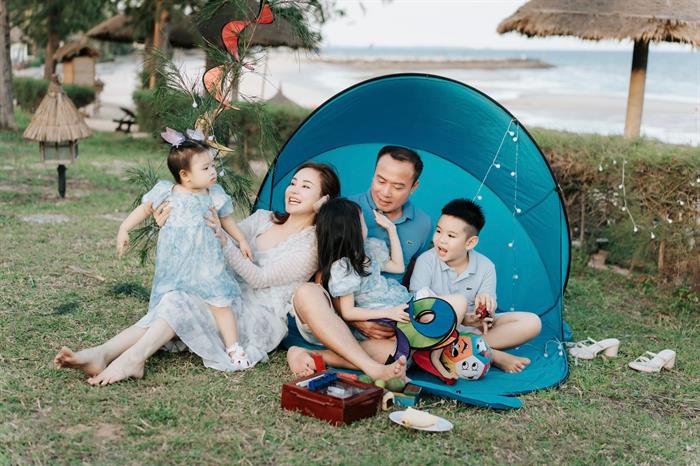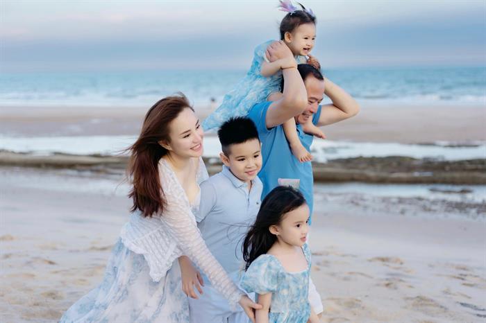 Vy Oanh cùng chồng đại gia và ba con đang tận hưởng những ngày thảnh thơi, sum vầy ở Mũi Né (Bình Thuận). Cả gia đình diện đồ tông xuyệt tông màu xanh dạo chơi trên bãi biển. Ba con của nữ ca sĩ gồm bé Voi 8 tuổi, bé Xu 6 tuổi và bé út Mio gần 2 tuổi.