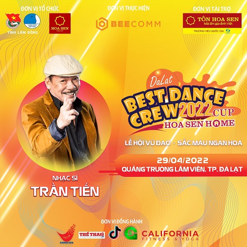 Được biết, nhạc sĩ Trần Tiến là “cây đa cây đề” trong làng âm nhạc Việt Nam. Ông đạt được nhiều thành tích lớn và nhận về nhiều giải thương vô cùng giá trị, nổi bậc là Giải thưởng nhà nước chuyên ngành âm nhạc năm 2007. Những tác phẩm của ông đã để lại tiếng vang lớn trong nền âm nhạc nước nhà như Giai điệu Tổ quốc, Chiếc vòng cầu hôn, Sao em nỡ vội lấy chồng, Mặt trời bé con, Chị tôi,… Khi nhận được lời mời tham gia sự kiện Dalat Best Dance Crew 2022 – Hoa Sen Home Cup, nhạc sĩ Trần Tiến không đắn đo và nhận lời ngay.