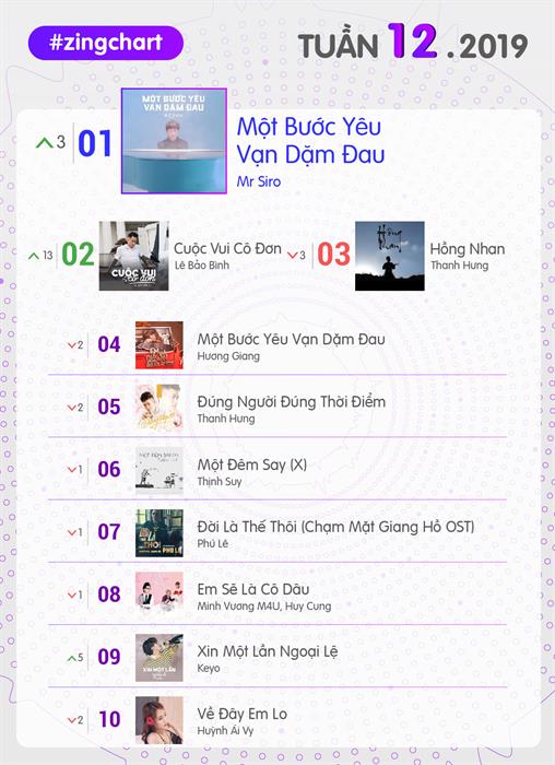 Một bước yêu vạn dặm đau chính thức soán ngôi vương của Hồng nhan tuần này. Đây là ca khúc thứ ba của Mr Siro, sau Càng níu giữ càng dễ mất và Tình yêu chắp vá, dẫn đầu BXH Vpop. Thành tích này càng chứng minh anh không chỉ “mát tay” trong việc tạo hit cho ca sĩ khác mà còn có thể kiêm nhiệm thêm vai trò giọng ca ăn khách.