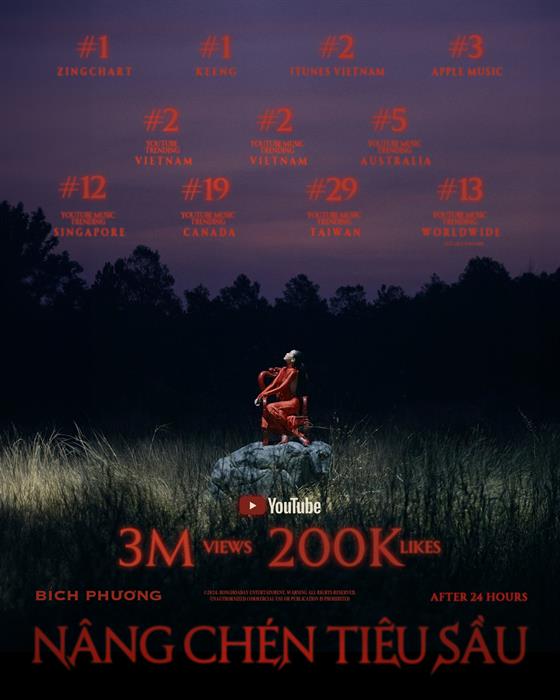 Ở BXH Music Trending Youtube toàn cầu, MV Nâng Chén Tiêu Sầu debut ở vị trí thứ 9 (nguồn từ Youtube Charts / web chính thức của YouTube). Audio ca khúc Nâng Chén Tiêu Sầu cũng đạt Top 1 Zingchart, Top 1 Keeng, Top 2 iTunes Việt Nam, Top 2 Apple Music.