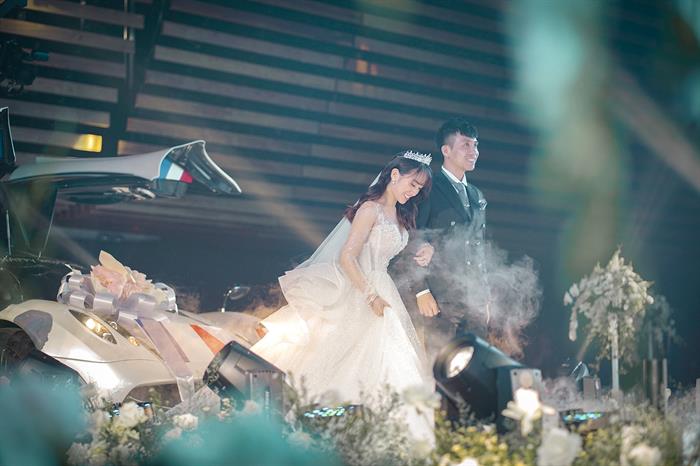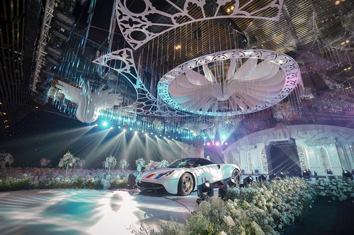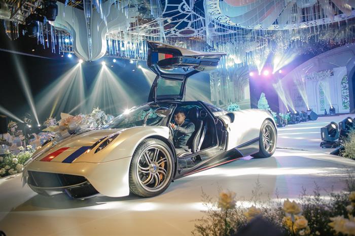 Không dừng lại ở đó, trong tiệc cưới tổ chức tại trung tâm sang chảnh quận 1, cô dâu Minh Anh còn được chính đại gia Minh Nhựa lái chiếc xe trị giá 80 tỷ Huyra Pagani đưa lên sân khấu khiến quan khách vô cùng ngỡ ngàng. Dàn xe siêu sang, đắt giá nhất trong bộ sưu tập của đại gia Minh Nhựa này cũng xuất hiện trong sảnh trưng bày ở tiệc cưới trong sự trầm trồ của quan khách.
