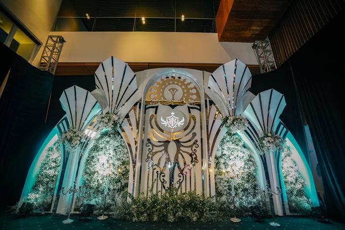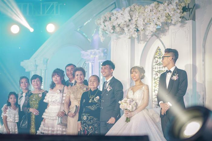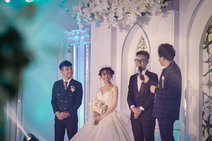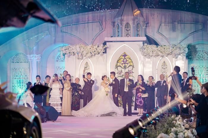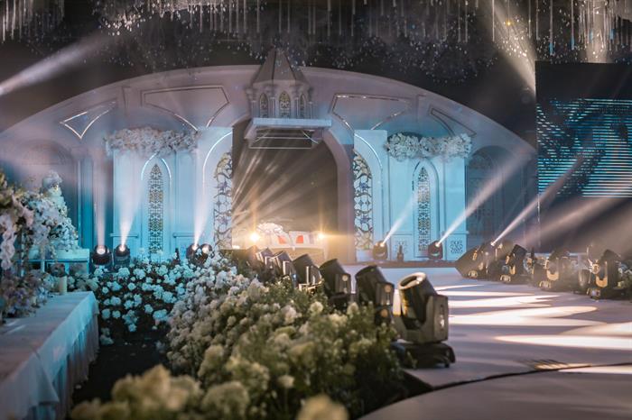 Đây là sự kiện đánh dấu cột mốc đáng nhớ cho cuộc sống hạnh phúc của đôi trẻ. Hôn lễ trong mơ trên vườn địa đàng của con gái đại gia Minh Nhựa Không gian tiệc cưới thiết kế như một tòa lâu đài tráng lệ trên không trung với hoa hồng trắng, mây bay như “chốn bồng lai tiên cảnh”. Toàn bộ không gian được lấy cảm hứng theo phong cách tân cổ điển và sử dụng những vật liệu trang trí cao cấp nhất do ekip JoliPoli kết hợp với thương hiệu trang trí yến tiệc Phong Design đến từ Hà Nội thực hiện.