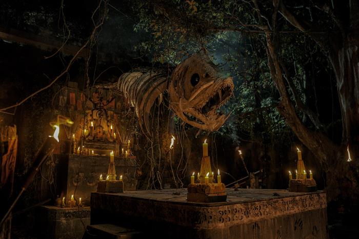 Bên cạnh đó, đại cảnh bàn làm phép với những ngọn đuốc lớn, sọ người, các lá bùa kì lạ và đặc biệt là bộ xương khô cực “khủng”, hình thù quỷ dị “lai” giữa người và cá được treo lên cao. Đã gợi mở về một nghi lễ gần như tế sống rùng rợn, kì bí và không kém phần tàn bạo. Đáng nói, hình ảnh Sam nằm trên bàn thờ tế lớn, đau đớn quằn quại khi lưỡi dao từ một nhân vật “bí ẩn” nào đó đang rạch vào da thịt khiến người xem không khỏi liên tưởng đến những phân đoạn… mổ bụng làm phép kinh dị trong Thất Sơn Tâm Linh.