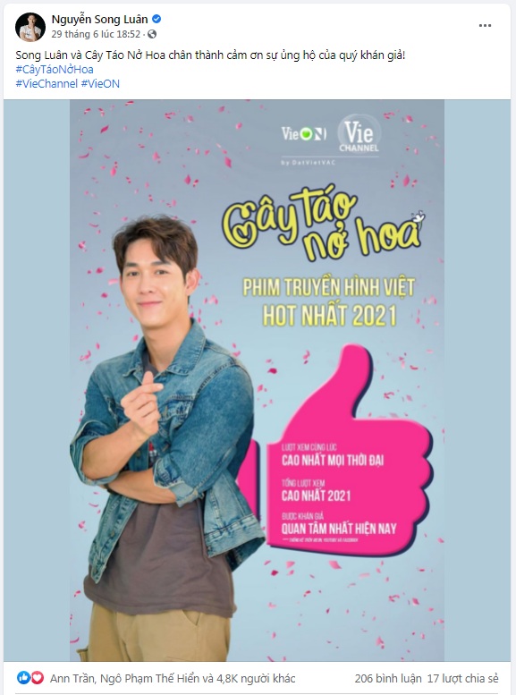 Sau khi vượt mốc hơn 350 triệu lượt xem sau 39 tập phát trên VieON, YouTube, Facebook, dàn sao nhà “Cây Táo” đồng loạt chia sẻ niềm vui và gửi lời tri ân đến những khán giả đã quan tâm, yêu thích và dành tình cảm cho bộ phim. Từ fanpage hội “bạn thân showbiz” Trương Thế Vinh, Thúy Ngân, Nhã Phương, Song Luân đến B Trần, Trịnh Thảo, Minh Trang… đều chúc mừng thành tích “khủng” của bộ phim, như thể “đại gia đình Cây Táo” đang mở tiệc online ăn mừng linh đình cùng khán giả trên mạng xã hội. Đáp lại, khán giả và fan của các diễn viên cũng chia vui cùng dàn sao và bày tỏ sự quan tâm, yêu thích dành cho bộ phim, cũng như mong đợi các diễn biến tiếp theo.