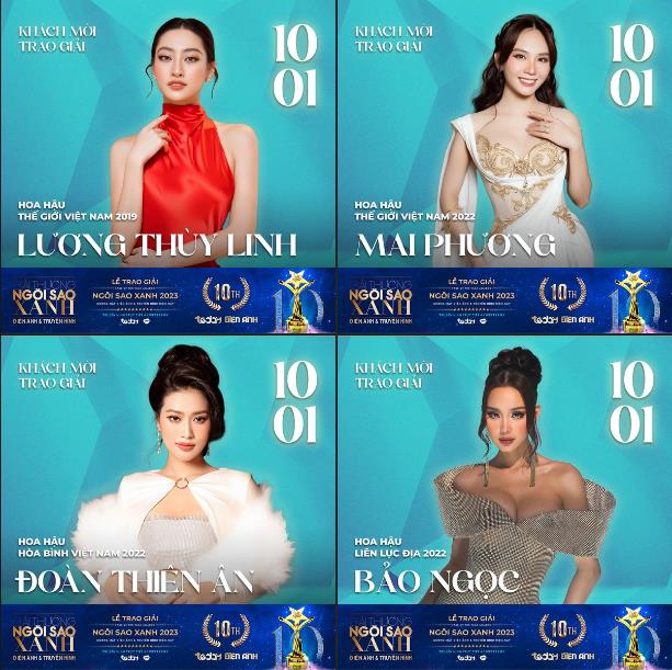 Vừa qua, cộng đồng fan sắc đẹp tại Việt Nam được dịp nhốn nháo khi ban tổ chức Ngôi Sao Xanh chính thức công bố dàn Hoa hậu sẽ xuất hiện lộng lẫy tại đêm gala diễn ra vào ngày 10/01 sắp tới với tư cách khách mời trao giải gồm: Hoa hậu Lương Thùy Linh, Hoa Hậu Mai Phương, Hoa Hậu Đoàn Thiên Ân và Hoa hậu Liên lục địa Bảo Ngọc. Cùng với đó, những giọng ca được yêu mến hàng đầu Vbiz như: Văn Mai Hương, Ưng Hoàng Phúc, Bùi Công Nam và Erik cũng sẽ góp mặt trình diễn, đêm đến vô số tiết mục nghệ thuật đặc sắc, hoành tráng để chiêu đãi khán giả của Ngôi Sao Xanh.