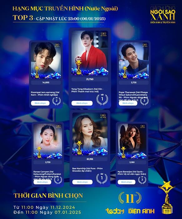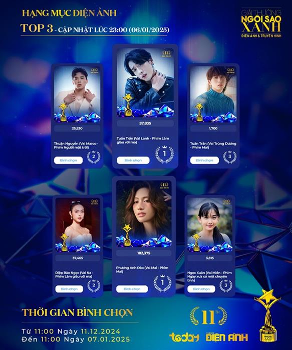 Giải thưởng Ngôi Sao Xanh lần thứ 11-2024 chính thức đóng cổng bình chọn dành cho khán giả vào 11:00 ngày 07/01 và chuyển sang giai đoạn tổng kết, đối với loạt giải “xuất sắc nhất’ vẫn đang được chấm điểm từ hội đồng chuyên môn.