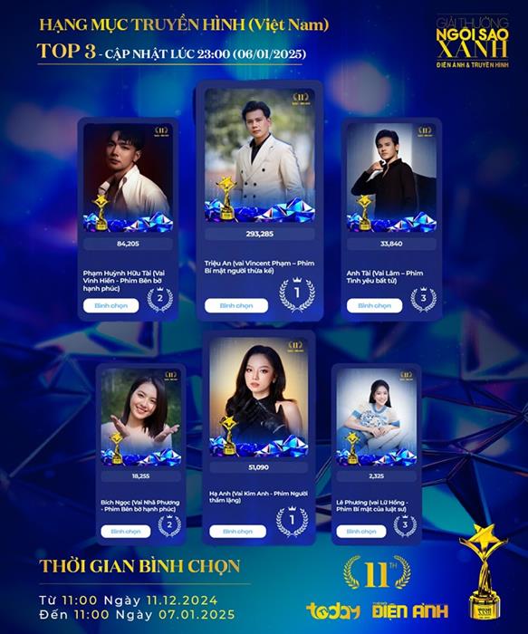 Đúng 11:00 ngày 07/01, cổng bình chọn Ngôi Sao Xanh lần thứ 11 – 2024 đã chính thức khép lại. Những đề cử trong các hạng mục được yêu thích nhất đã có cuộc cạnh tranh đầy quyết liệt và đến thời điểm hiện tại top 3 đang dần lộ diện. Tại chặng đua cuối cùng của Ngôi Sao Xanh năm nay không khí tranh tài càng thêm gay cấn, náo nhiệt khi BTC quyết định nhân 5 số điểm cho tất cả hạng mục voting từ 23:00 ngày 06/01 đến phút chót đóng cổng bình chọn 11:00 ngày 07/01.