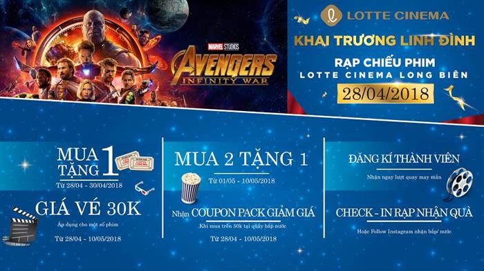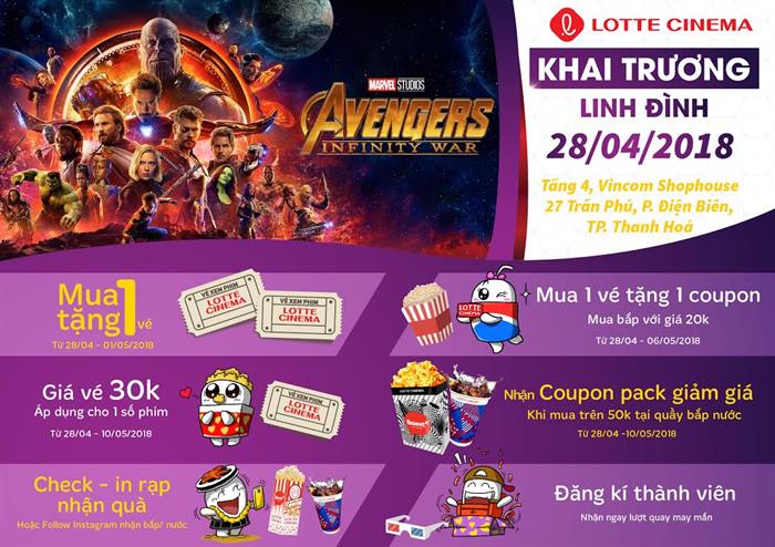 Tintuc - Lotte Cinema khai trương cùng lúc 3 cụm rạp mới ở Thanh Hóa, Bảo Lộc và Long Biên với 14 phòng chiếu phim, 2,000 ghế ngồi để đáp ứng nhu cầu xem Avengers đang cực nóng những ngày này