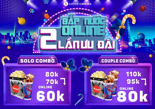 Xem phim vui thì phải có bắp và nước, Lotte Cinema ngay lập tức có ngay combo bắp nước online, 60,000 VNĐ cho combo 1 bắp 1 nước, tiết kiệm 10,000 VNĐ so với mua ở rạp; 80,000 VNĐ cho combo 1 bắp 2 nước, tiết kiệm 15,000 VNĐ so với mua ở rạp.