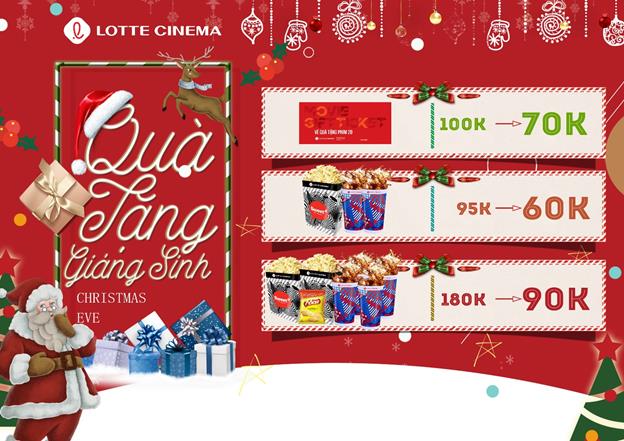 Nếu bạn cần mua vé quà tặng, combo quà tặng cho bạn bè người thân dịp Giáng Sinh này, Lotte Cinema mách nhỏ cho bạn bí kíp mới cực nhanh là Kho Quà Tặng trên website và ứng dụng. Voucher xem phim 2D giảm 30% từ 100,000 VNĐ chỉ còn 70,000 VNĐ; combo bắp nước cả nhà bốn người 180,000 VNĐ giảm còn 90,000 VNĐ; combo bắp nước cho cặp đôi 95,000 VNĐ giảm còn 60,000 VNĐ.