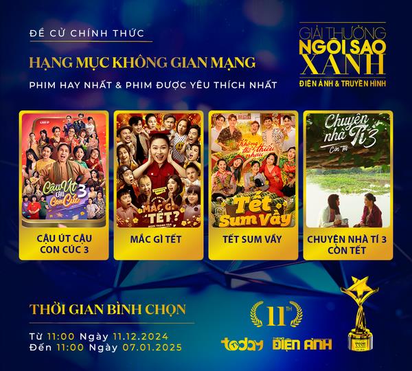 Đến hẹn lại lên, Giải thưởng Ngôi Sao Xanh diễn ra thường niên mỗi dịp cuối năm, có tính chất tổng kết 1 năm hoạt động đầy sôi nổi của nền nghệ thuật nước nhà ở các lĩnh vực điện ảnh, truyền hình và không gian mạng (mở rộng từ hạng mục phim chiếu mạng). 2024 với sự góp mặt của nhiều bộ phim hấp dẫn cùng hàng loạt gương mặt nghệ sĩ tiêu biểu, tài năng, cuộc đua cho các ngôi vị cao nhất tại Ngôi Sao Xanh mùa giải thứ 11 sẽ chính thức khởi tranh từ 11/12/2024 và được dự đoán là khá gay cấn.