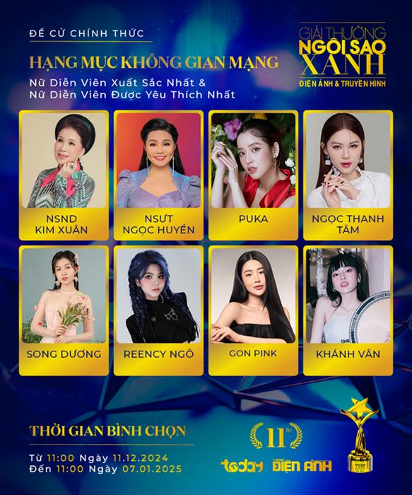 Việc thành công của các tác phẩm phát sóng trên Không gian mạng không chỉ là ‘bước đệm’ khởi đầu cho nhiều nghệ sĩ trẻ tài năng được công chúng biết tới, được thử sức nhiều hơn với nghệ thuật trước khi “vẽ” nên nhiều điều lớn lao. Mà còn là cách để những nghệ sĩ nổi tiếng vốn đã giàu kinh nghiệm thậm chí là ‘lão làng’ dùng để tự thử thách bản thân, rèn luyện cá tính diễn xuất và giữ ngọn lửa đam mê yêu nghề. Và giữa nhiều những gương mặt mới mẻ xuất hiện trong loạt phim phát sóng trên các nền tảng Không Gian Mạng, nổi bật lên vẫn là các tài năng ấn tượng chính thức lọt vào đề cử Ngôi Sao Xanh 2024, sẽ được Hội đồng nghệ thuật bình chọn và Khán giả bình chọn: NSND Kim Xuân, NSƯT Ngọc Huyền, Puka, Huỳnh Lập, Võ Tấn Phát, Minh Dự, Ngọc Thanh Tâm, Khánh Vân, Lãnh Thanh, Lê Hải, Trịnh Thảo, Cody Nam Võ, Gon Pink, Reency Ngô, Gia Long, Song Dương, Tùng Kang,…