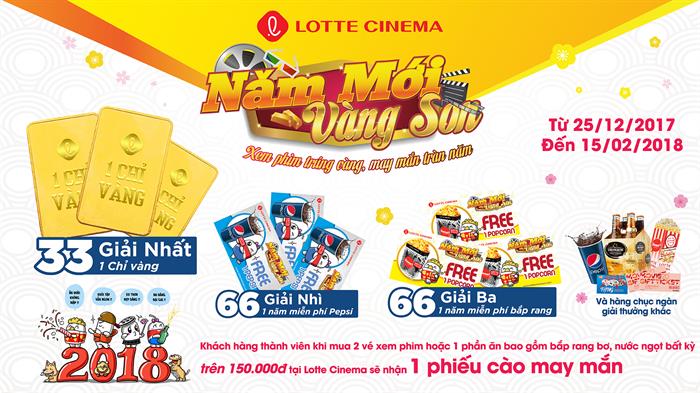 Trong dịp năm mới, xem phim giải trí là lựa chọn không thể bỏ qua, đặc biệt với danh sách dài các bộ phim hay không nên lỡ nhịp. Và cùng với đó, là sự kiện ưu đãi vàng, xem phim cào trúng ngay tại hệ thống rạp chiếu phim Lotte Cinema trên toàn quốc. Với giải thưởng 33 chỉ vàng, ưu đãi miến phí bắp nước cả năm, cùng với các phần quà như combo nước táo Strong Bow, nước ngọt Pepsi, phiếu ăn kem Dairy Queen … Để biết thêm chi tiết và tham gia chương trình, truy cập ngay vào đây: http://bit.ly/2vnItal