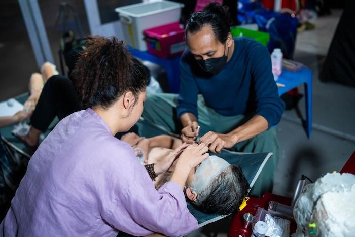 Mạc Văn Khoa (vai ông Danh) gọi diễn viên đóng vai ‘bà già áo đỏ’ với chiếc lưng gù là “ngoại”. Anh cho biết đây là lần đầu tiên tham gia một dự án phim điện ảnh mà có nhân vật phải trải qua 4-5 tiếng hóa trang. Lần đầu gặp “ngoại” trên phim trường, anh đã giật mình, thậm chí tái mặt vì sợ.