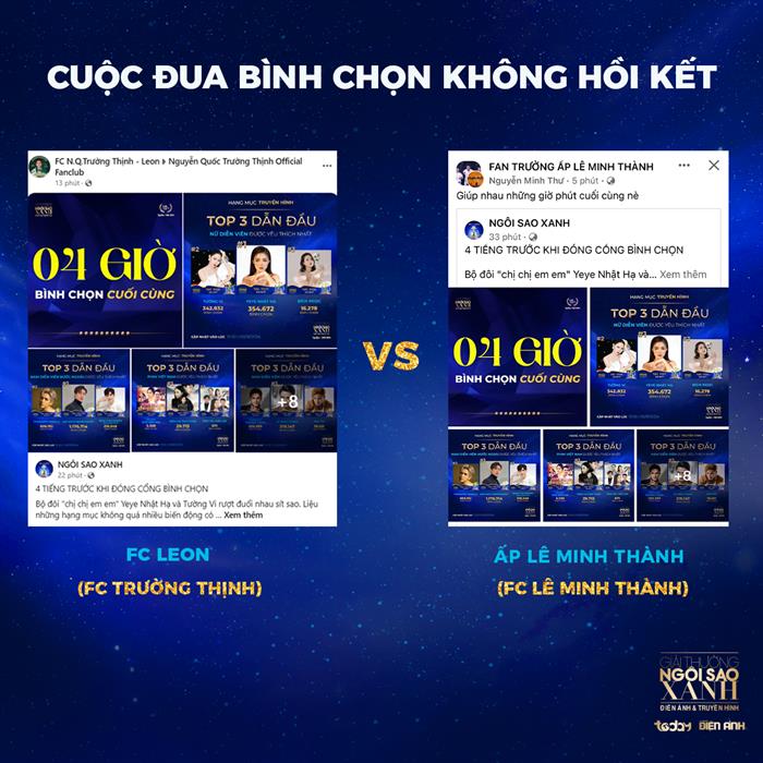 Đường đua bình chọn Ngôi Sao Xanh qua mỗi năm vẫn luôn là cuộc chiến khốc liệt và đầy bất ngờ, năm nay cũng không ngoại lệ khi các ứng viên liên tục bứt phá ngoạn mục, rượt đuổi số vote đầy sít sao. Không chỉ các nghệ sĩ tích cực kêu gọi bình chọn ở những giây nước rút cuối cùng mà cộng đồng fan hâm mộ cũng chung sức đồng lòng cạnh tranh nảy lửa để giúp thần tượng mình yêu thích được chạm tay cúp Ngôi Sao Xanh danh giá. Được đánh giá là một trong những FC ‘máu chiến’ nhất ngay từ phút đầu cuộc đua, cộng đồng ‘Fan Trưởng Ấp Lê Minh Thành’ (FC Lê Minh Thành) khiến các ‘đối thủ’ phải dè chừng khi dốc toàn lực voting và làm nên những thành tích đáng nể, liên tục đưa ‘idol’ leo top 1 trên bảng xếp hạng. Không kém cạnh, ‘FC Leon’ (FC Trường Thịnh) khiến đường đua Ngôi Sao Xanh thêm phần gay cấn khi đối đầu trực diện, bám sát số voting của FC Lê Minh Thành thậm chí nhiều lần còn vươn lên dẫn trước.