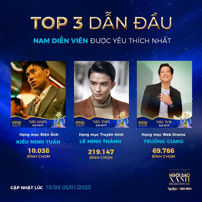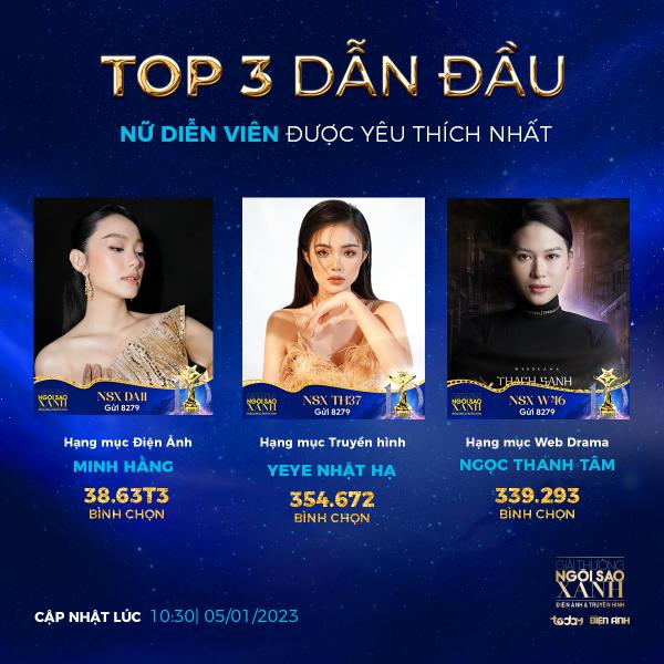 Trước khi kết thúc thời gian bình chọn, chặng đua cuối cùng tại Ngôi Sao Xanh năm nay chứng kiến một màn rượt đuổi số vote gắt gao giữa các đề cử. Cách biệt không quá xa khiến vị trí đầu mỗi hạng mục liên tục thay đổi và khó đoán. Các top 3 được ‘yêu thích nhất’ của hạng mục Điện ảnh, Truyền hình và Web Drama tính đến nay đều đang dần lộ diện. Song song đó, loạt giải thưởng ‘xuất sắc nhất’ do HĐNT đánh giá thì vẫn còn là một ẩn số khiến người hâm mộ không khỏi nôn nao ngóng đợi đến đêm gala công bố.