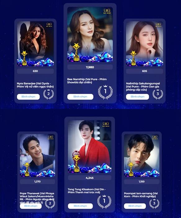 Tại bảng đấu dành cho các đề cử nước ngoài ngay tuần đầu nhập cuộc đã có phần nảy lửa. ‘Ong chúa’ Bee Namthip từng chiến thắng giải ‘Nữ diễn viên nước ngoài được yêu thích nhất’ – Ngôi Sao Xanh 2023 và năm nay tiếp tục giữ vị trí top 1 trong tuần bình chọn đầu tiên với 7.980 điểm. Trai đẹp Tong Tong Kitsakorn chiếm trọn tình yêu thương của khán giả với vai Din trong phim Thanh mai trúc mã cũng đang là ‘chiến binh’ số một của bảng ‘Nam diễn viên nước ngoài được yêu thích nhất’, sở hữu 4.245 điểm. Song, top 1 ‘Phim nước ngoài được yêu thích nhất’ hiện đang thuộc về tác phẩm Ấn Độ – Vệ nữ viên ngọc thần.