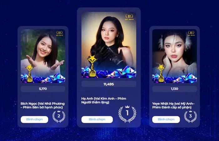Nhiều ‘bóng hồng’ Truyền hình kèn cựa nảy lửa tranh xuất vào top 3 ‘Nữ diễn viên được yêu thích nhất’ và cái tên tạm dẫn đầu tuần thứ nhất chính là Hạ Anh (vai Kim Anh – phim Người thầm lặng), với 11.495 điểm. 5.170 điểm là kết quả của Bích Ngọc (vai Nhã Phương – phim Bên bờ hạnh phúc) giúp cô nàng tạm giữ vị trí số 2. Cái tên còn lại trong top 3 không ai khác ngoài Yeye Nhật Hạ (vai Mỹ Anh – phim Đánh cắp số phận) – 1.130 điểm. Trong khi đó, top 3 bảng xếp hạng ‘Nam diễn viên được yêu thích nhất’ lại quy tụ những cái tên bất ngờ: Triệu An dẫn đầu với 10.465 điểm, xếp thứ 2 là Anh Tài với 6.215 điểm và vị trí số 3 gọi tên Hữu Tài với 4.025 điểm.