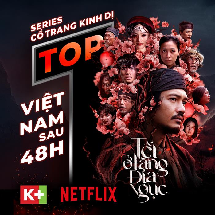 Tintuc - Ngày 25.10, chỉ sau 2 tập phát sóng đầu tiên vào Thứ hai và Thứ ba đầu tuần qua, Series Tết Ở Làng Địa Ngục chễm chệ Top 1 cả hai nền tảng trả phí K+ lẫn Netflix.