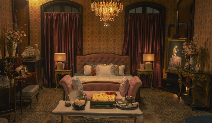 Phòng Lý Lệ Hà được thiết kế theo phong cách hoàng gia, các nội thất theo tông màu vàng hoàng hậu. Thể hiện tính cách và khát khao của nhân vật này.