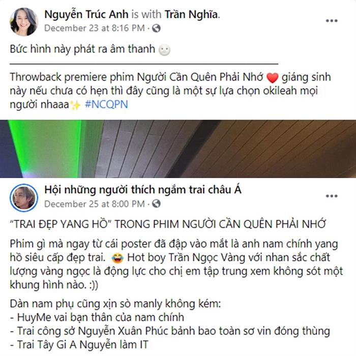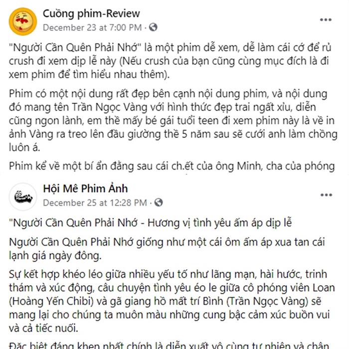 Người Cần Quên Phải Nhớ hiện đang chiếu tại các rạp trên toàn quốc. Bộ phim có sự góp mặt của Hoàng Yến Chibi, Trần Ngọc Vàng, HuyMe, Karen Nguyễn, Nguyễn Xuân Phúc, Thái Hòa, Thanh Thuý, Nguyễn Dương, NSUT Đức Hải và sự xuất hiện đặc biệt của ban nhạc Chillies…