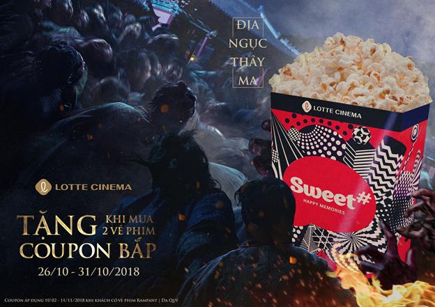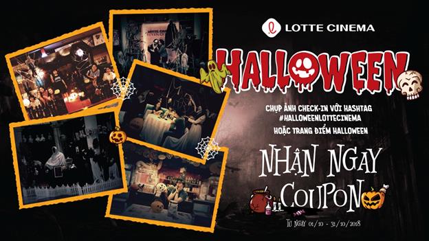 Thêm vào đó khách hàng đến xem và chụp ảnh check in cùng với khu vực đã trang trí Halloween sẵn của Lotte Cinema đăng lên facebook với hashtag #halloweenlottecinema sẽ nhận được phiếu mua bắp vừa với giá chỉ 20.000VNĐ.