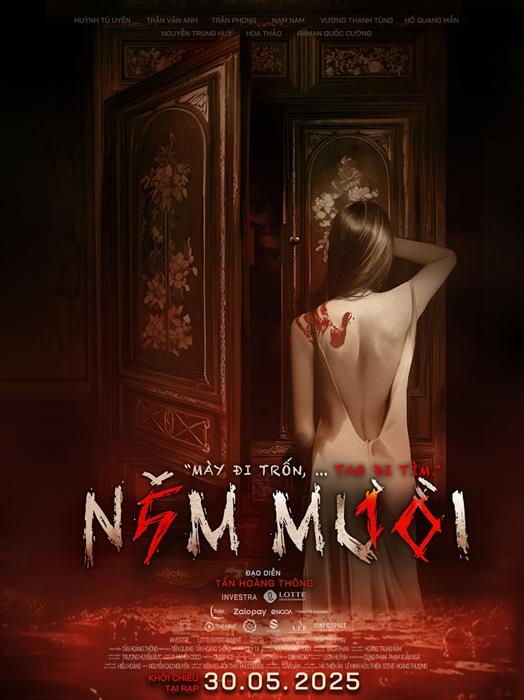 Hình ảnh đầu tiên của Năm Mười hé lộ khoảnh khắc một cô gái trong trang phục quyến rũ úp mặt vào tủ, đếm “Năm, mười…” để bắt đầu trò chơi, trong khi những người khác tìm chỗ trốn. Điểm rùng rợn nằm ở vệt máu hình bàn tay trên lưng cô gái, cùng cánh cửa tủ hé mở, như một lời cảnh báo về những nguy hiểm đang rình rập. Poster phim với tông màu đỏ – đen tạo cảm giác bất an, trong khi câu tagline “Mày đi trốn, tao đi tìm” gợi mở về một trò chơi ám ảnh.