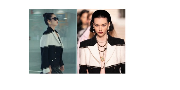 Dù chỉ mang 2 màu đen trắng cơ bản, chiếc áo khoác vải tweed nằm trong BST “Métiers d’Art 2019/20” vẫn đủ sức khiến người xem trầm trồ với mức giá hơn 190 triệu đồng. Phom dáng thanh lịch, màu sắc nhã nhặn kết hợp kiểu tóc búi cao góp phần tôn lên nét sang chảnh, quyền lực cho nhân vật Khánh Tiên.