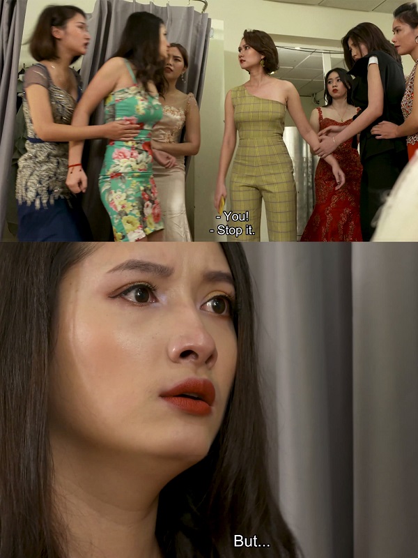 Cũng nhờ Hằng phá trang phục, mà Liên phải chật vật mãi đến cuối buổi diễn mới có thể bước lên sàn Catwalk và nghiễm nhiên được mọi người tưởng là vedette. Hằng tức đến phát điên khi gậy ông đập lưng ông. Một trận chiến giữa hai nữ người mẫu đã diễn ra ở hậu trường. Trước những lời thách thức, miệt thị, thậm chí là hăm dọa của Hằng, Liên đã tung chiêu hiểm, khiến Hằng nếm mùi bị mang tiếng ức hiếp đàn em trước mặt giám đốc công ty. Hằng chính thức “thất sủng” từ đây.
