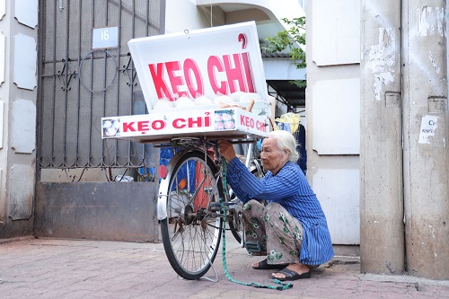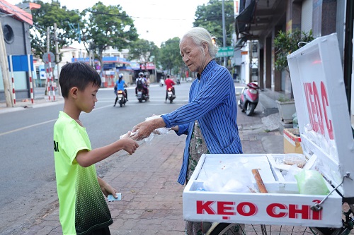 Vậy mà ở độ tuổi gần đất xa trời, cụ Bình vẫn miệt mài níu giữ món ăn mang lại vị ngọt cho đời này. Nhưng mấy ai biết, đằng sau hình ảnh người phụ nữ tóc bạc “yêu nghề” ấy là cả một hoàn cảnh cần nhiều sự sẻ chia. Cụ Bình hiện đang sống trong một căn nhà trọ nhỏ nằm trên con đường Xô Viết Nghệ Tĩnh thuộc thành phố Vũng Tàu. Trước đây, cụ sống cùng chồng nhưng cụ ông chẳng may qua đời cách đây 3 năm và kể từ đó cụ Bình chỉ thui thủi một mình. Bám trụ với nghề bán kẹo chỉ ngót nghét 15 năm, cụ Bình được mọi người xem như là “người lưu giữ” món ăn tuổi thơ của nhiều người. Có lẽ, chiếc xe kẹo chỉ không chỉ là cái nghề để cụ mưu sinh mà còn là “cái cớ” để cụ ra ngoài gặp gỡ người này, người kia, kiếm thêm chút niềm vui giữa cuộc sống đơn độc này.