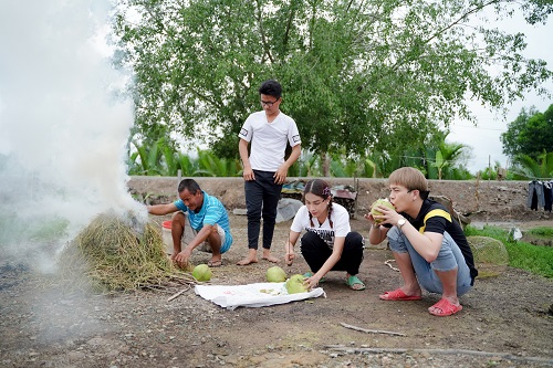 Đồng hành cùng chú Khôi là cặp đôi khách mời chị em “làng hài” Khả Như – Duy Khánh tiếp tục tay cầm rổ, tay xách thúng rơm để nướng cá ngoài đồng chuẩn bị cho bữa cơm trưa đậm chất dân dã miền Tây. Trong thời gian chờ cá chín, chú Khôi đã chia sẻ câu chuyện cuộc đời mình.