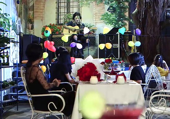 Tiếp đó, Khánh Huyền đến điểm hẹn cùng Quốc Huy. Đó là một quán cafe lãng mạn với hoa, bóng bay và dàn nhạc acoustic. Vừa bước vào, cô nàng nhận được một bó hoa tươi từ Quốc Huy và không giấu được cảm xúc “ôi lãng mạn quá”.