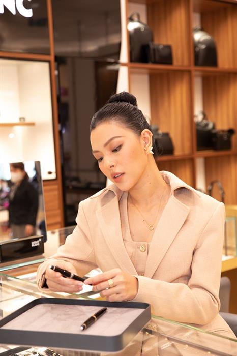 Hướng đến hình ảnh tươi mới, thanh lịch, Tú Hảo cũng dành tình yêu đặc biệt cho chiếc bút Montblanc Meisterstuck tại cửa hàng Montblanc để lưu lại những kỷ niệm đáng quý của mình.
