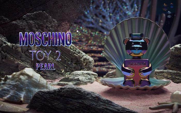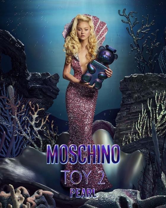 Với sự kết hợp cùng nàng thơ Devon Aoki, chiến dịch Moschino Toy 2 Pearl đưa người xem đến với khung cảnh đáy đại dương. Siêu mẫu Devon Aoki mang trên mình chiếc váy đuôi cá nổi bật với ánh kim sa hồng, gợi nhớ đến hình ảnh biểu tượng của cô được chụp cách đây hơn hai thập kỷ. Nhẹ nhàng đặt lên vỏ sò, sản phẩm trong tay cô tựa như một kho báu quý giá, tỏa sáng giữa xứ sở thần tiên nơi đáy đại dương bí ẩn.
