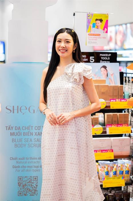 Trong sự kiện lần này, nàng hậu mong muốn giới thiệu đến người tiêu dùng sản phẩm Tẩy da chết Muối Biển Xanh. Sản phẩm tẩy da chết Muối Biển Xanh SHEGAN với hạt vi xơ thực vật, kết hợp với nhiều tinh chất quý trong thiên nhiên như chiết xuất muối biển xanh, nhân sâm, hoa thanh cúc, tảo bẹ wakame, trà xanh… để nuôi dưỡng và tăng cường sức đề kháng của da. Sản phẩm này không chỉ giúp làm sạch, loại bỏ đi lớp da chết một cách dễ dàng mà còn có tác dụng cải thiện độ đàn hồi, săn chắc, ngăn ngừa lão hóa da và giảm stress, trầm cảm cho người sử dụng.