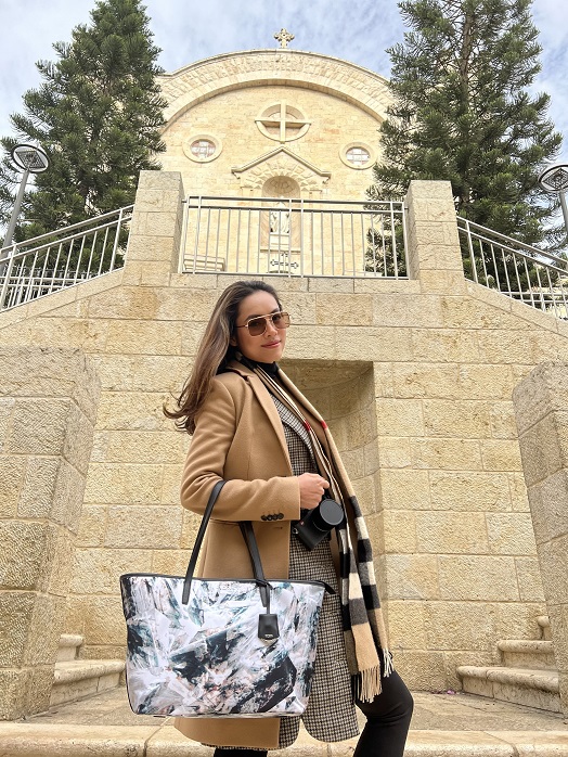 Khi tham quan các địa điểm nổi tiếng tại vùng Đất Thánh – Israel, Á hậu Hoàng My lựa chọn chiếc túi xách được in vải hoa tỉ mỉ từ BST Voyageur để mang bên mình những món vật dụng cần thiết nhưng vẫn giữ được nét điệu đà của một quý cô. Và khi cần sự tiện lợi để di chuyển nhiều, cô lại diện một cây đen cơ bản cùng quần thể thao và chiếc túi bao tử bằng da bóng đến từ BST Devoe.