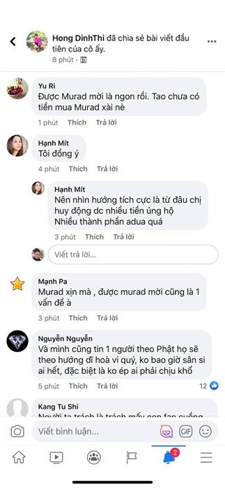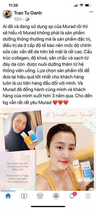 Trên fanpage cá nhân hôm 02/11/2020, ca sĩ Thủy Tiên đăng tải bài viết chia sẻ cảm nhận khi sử dụng sản phẩm Murad, nhận được sự quan tâm lớn từ dư luận. Đông đảo khách hàng đã có phản hồi tích cực về chất lượng, hiệu quả của các sản Murad khi từng sử dụng qua, cũng như bày tỏ sự ủng hộ Thủy Tiên để tiếp lửa tinh thần giúp nữ ca sĩ hoàn thành tốt công tác cứu trợ đồng bào miền Trung đang chịu thiệt hại nặng nề của lũ lụt.